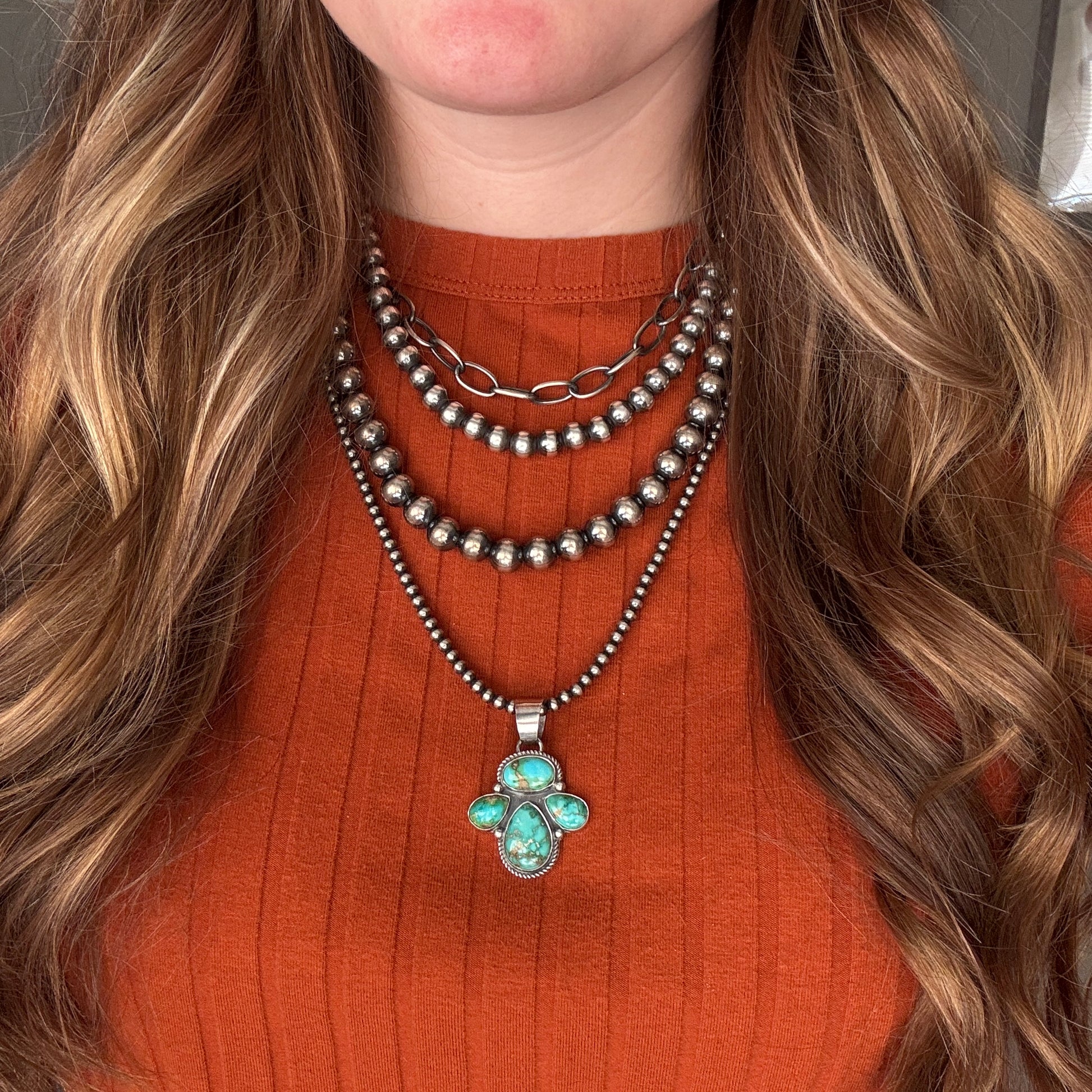Sonoran Gold turquoise with sterling silver details. She is 1 7/8" long and fits up to 8MM pearls. The pearls shown in the photos are not included.